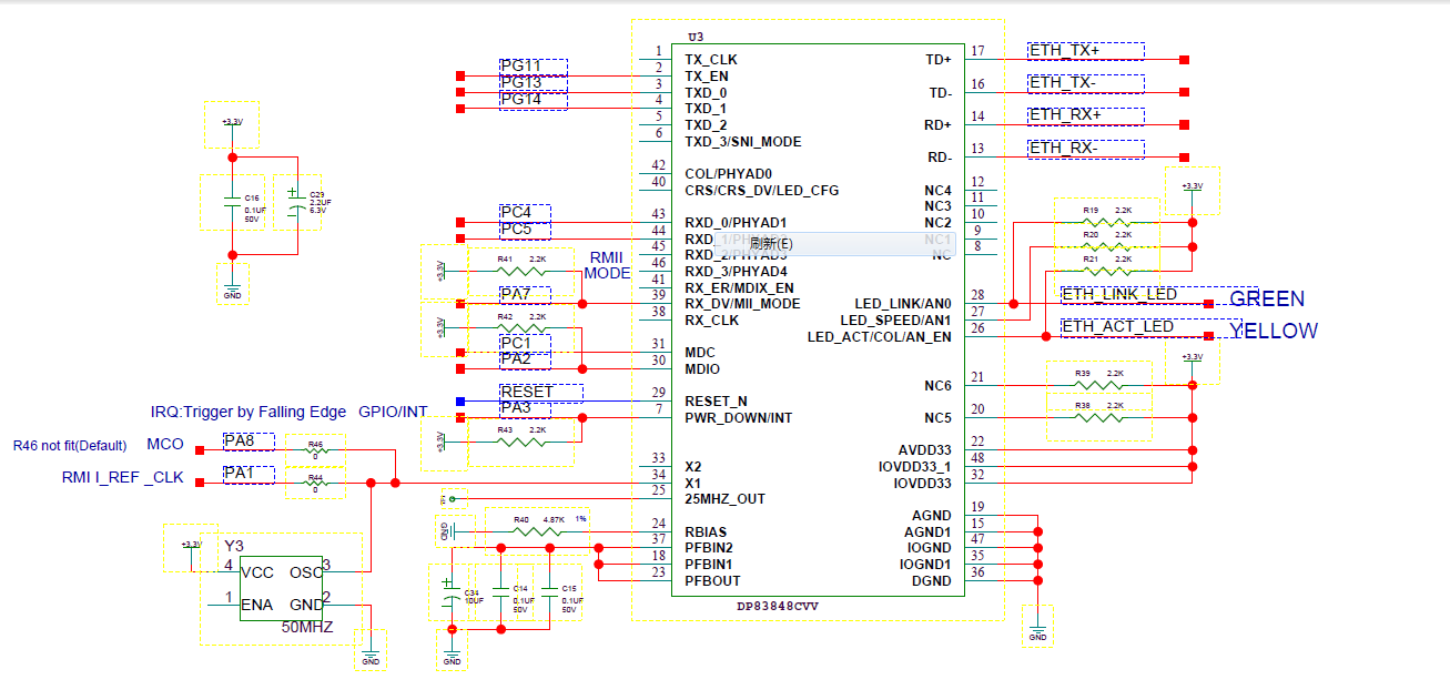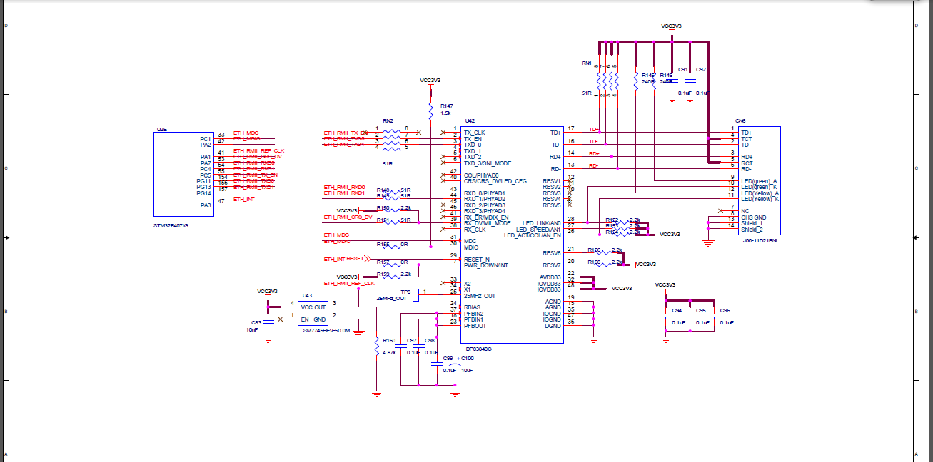 大家好!这边使用STM32F407+DP83848C构建了100M以太网电路,在用ST提供的TCP echo server例程进行网络测试时,MCU发现下载完程序,使用命令窗口发送数据时,可以正常接收,断电后重新上电,发送数据时提示为超时,使用硬件复位PHY,按下连接到PHY芯片Reset_N管脚的按钮后,又可以正常发送接收数据,这边想得是不是上电时没有满足PHY的上电时序?请问有人碰到过这个情况吗?电路图详见附件