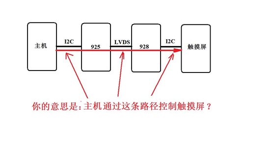 应用:928那边的i2c连接触摸屏,把触摸屏的数据通过lvds传给925那边的主机,也就是设想i2c通过两块芯片实现主机控制触摸屏的功能。(i2c直通的功能)