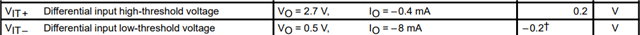 这里确实写错,VIT+(max)=0.2V ,VIT(min)=-0.2V。所以真值表这里应该是VIT+<=VID,即 VID>=0.2V 时输出为高。非常感谢您的指正。 另外我看这款收发器是比较老的产品了,如果您是新设计,可以考虑其他较新的产品来替代。