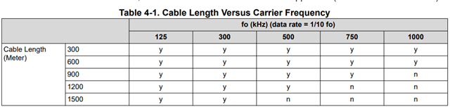 另外,载波频率越高,cable的损耗越大,那么可支持的传输距离就会越短。下表给i、出了根据实验室数据列出了每个载波频率可实现的最大电缆长度。测试采用的是20-AWG UL2464的线缆。这个表格中可以看到1M载波的话,使用20-AWG UL2464电缆传输600m是没问题的。