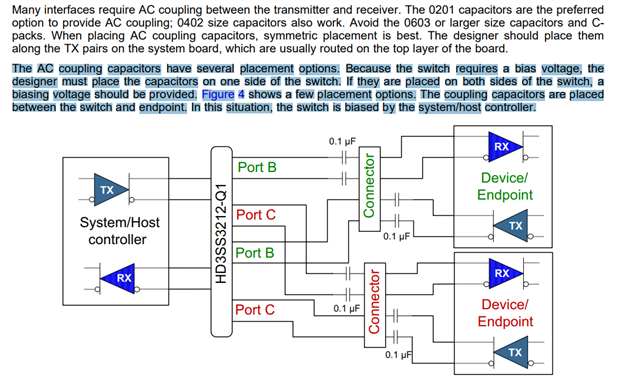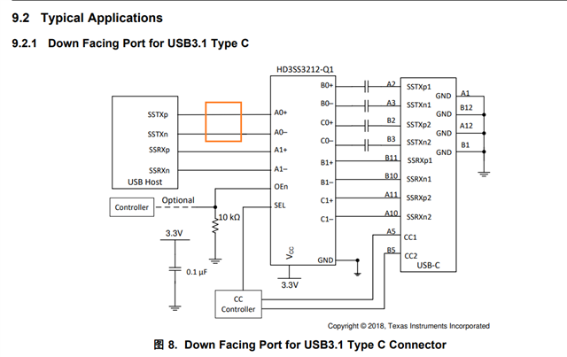 HD3SS3212的偏置电压来自于host,后端USB -C的TX端由于加了耦合电容,偏置电压来自于内部偏置电路,如果内部没有集成偏置电路的话,则需要外部搭建分压电路重新建立新的共模电压。