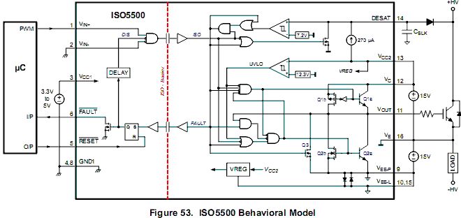 对于一个 DESAT 故障,为防止较大 di/dt 感应出破坏力的尖峰电压,ISO5500 启动一个软关断过程来将 IGBT/MOSFET 电流缓慢减少至零。 然后穿过隔离隔栅发送一个故障信号,驱动开漏特性的 FAULT 输出有效低电平信号, 在FAULT输出低电平期间输入信号被阻断。 并在RESET引脚上出现逻辑低电平之前。FAULT 一直保持低电平。