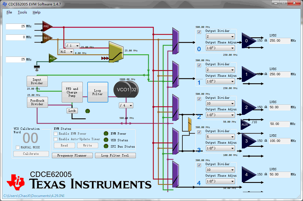 问题描述:1、我们自己做的板子,从AUX输入,频率25MHz,按下图所示配置,相位一直不锁定,PLL_LOCK输出为方波形式,output4设置输出为50MHz,实际测得输出频率为47.8MHz,output3设置输出为100MHz,实际测得输出频率为95.6MHz,说明从VCO出来4分频后不是500MHz,而是478MHz,我的寄存器配置为