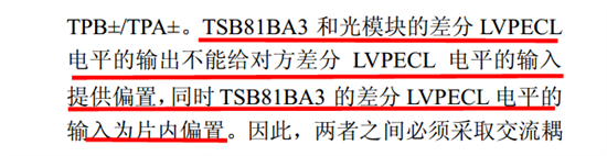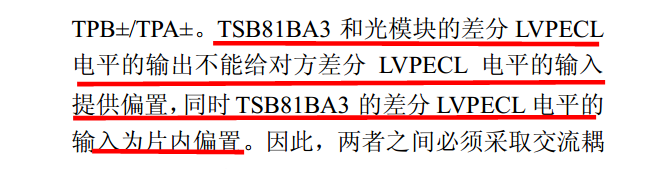 tsb41ab3和 tsb81ba3的电平标准是一样的,1394a的差分输出Vod为172mV~265mV, 1394b的Vod典型值为700mV,并不是标准的LVPECL电平,在和光模块进行耦合时,首先需要弄清光模块的输入共模电压范围,中间是否需要加一些电平转换电路,你可参考这篇文档中的3.1部分的介绍有关和光模块之间是如何连接的: