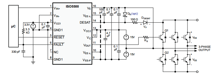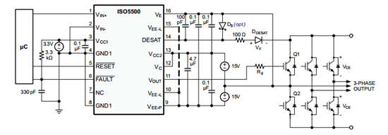 下图显示了采用ISO5500驱动一颗IGBT的示意图,采用6颗便可实现对整个模块的驱动,用于控制电机之类的。