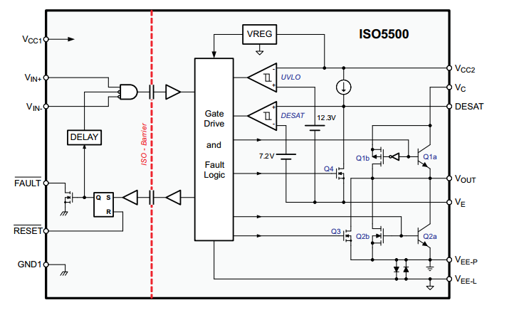 DESAT检测:检测IGBT的漏极电流,对IGBT实现过流保护,当IGBT漏极电流过大,ISO5500将实行软关断开关闭输出。