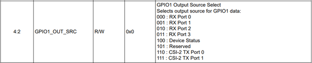 GPIO1~4是可以配置来自于哪个RX port。比如GPIO1_OUT_SRC配置为000,即为RX port 0, 所以是可以通过0x11~0x14的寄存器来知道是哪个RX port lock或unlock状态,从而知道是哪个camera拔掉了。