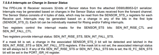 数据手册有介绍几种哪些情况会引起中断,比如960的RX port会对解码数据进行检测,比如有发生parity error会导致中断,解码有误导致中断,任意一个RX port接口的频率发生变化也会导致中断。通过960来对sensor端进行判断中断的介绍可以参考7.7.9.4的介绍,并且通过960可以读取sensor的状态,sensor状态寄存器是0x51~0x53: