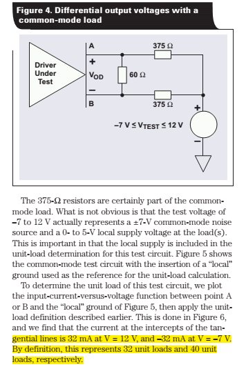 3、在“The RS-485 unit load and maximum number of bus connections”一文中,Figure4下面的一段话中讲到当V=12V时,32mA和-7V时-32mA这两个值是怎么确定的?是如何计算得出的?