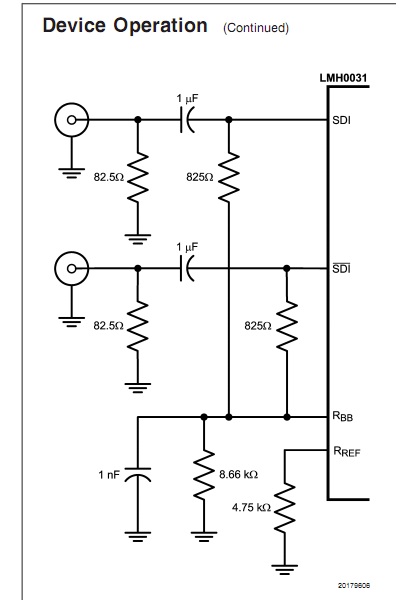 是否就不用了呢?那么阻抗匹配的82.5欧姆和825欧姆电阻是否就都去掉,改在原来接82.5欧的地方接匹配75欧姆(接75欧同轴线,或者50欧匹配lmh0034)这样呢?是接在隔直电容前面接地吧?