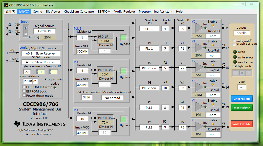 配置如下。灌入20M的正弦信号,却无输出。通过Smbus可以正常的寄存器读写。