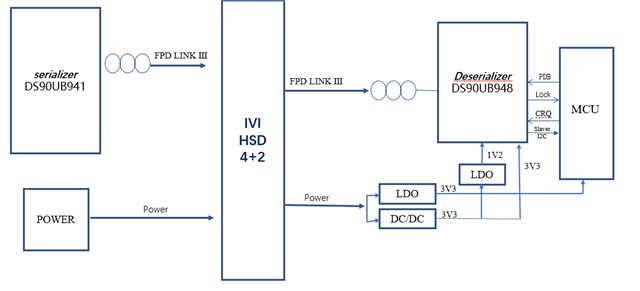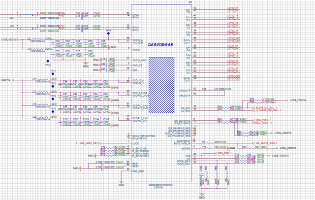 您好,近期接到数起客诉问题,主机端分析结果为主机端找不到948芯片,无法建立正常通信,进而导致显示黑屏,我司解串器TI948电路为双通道LVDS输入,两组1lane+4lane的OLDI输出,主机端使用的串行器芯片为TI941,由于均是客诉实车出现的问题,目前台架测试未出现,因此暂未获取到比较有效的异常信息,我司排查之后暂无好的分析方向,围绕TI948相关电路,帮忙check一下我们的原理图设计,下附框图,看下黑屏是否可能跟TI948相关电路设计有关。谢谢