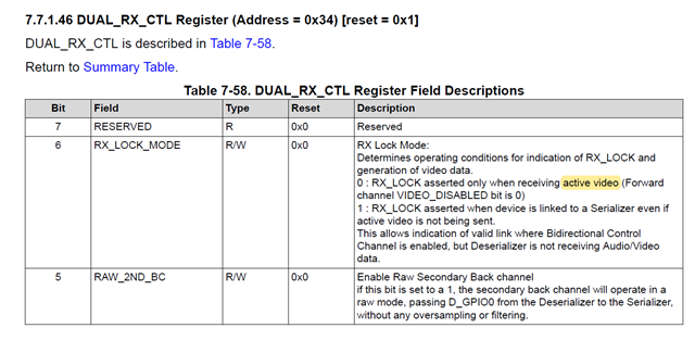 如果您遇到的问题是I2C问题,那么有可能与正向通道或反向通道相关。但是,您没有只属于正向通道问题的视频,默认情况下,您的锁定状态将检查活动视频,请参阅 DES 侧的寄存器0x34。