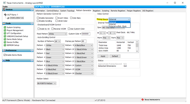 2-Internal-w/ext clk为 HS、VS、DE 和视频在内部生成,但使用外部 PCLK (如果您在此模式下看到问题,这表明源存在外部 CLK 问题)