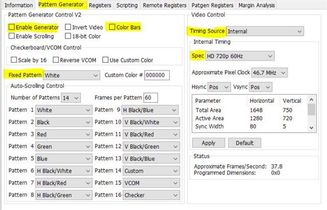 接下来,您需要选择计时源-根据上述3种模式选择计时,对于规格来说您可以选择显示屏所需的分辨率,或者定制您自己的分辨率。 您可以运行固定图形,也可以选择色条,或者如果您选择执行固定图形并启用滚动以浏览多个图形,从而选择所需的任何方法。 最后,您可以启用生成器开始发送 Patgen 与您已配置的设置。