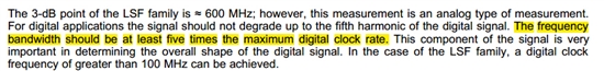 LSFxx的-3dB带宽为600MHz,200MHz应该是没问题的,关于上拉电阻的确定,是当内部晶体管导通时限制电流为15mA,所以可根据公式1来计算出不同电压情况下的上拉电阻值,因此上拉电阻越大,晶体管导通时流经的电流越小,应该是没问题的。你的应用建议还是申请样片实际验证下。