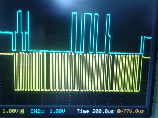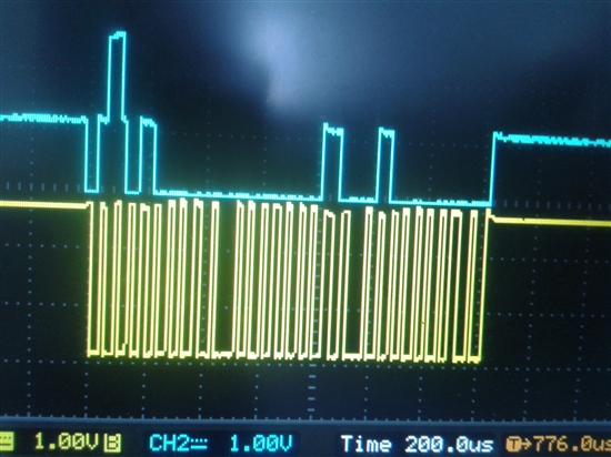 3、我看了秒接收到的数据,当为0时为高电平的一半,为1时就是高电平