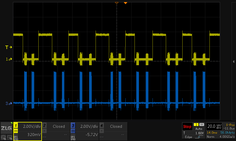 如图2,黄色为spi ncs信号,蓝色为spiSCLK信号,由此观察,感觉是can总线信号是在一次spi信号传输完后才发一帧,因此模块can帧间隔长达1.1ms。