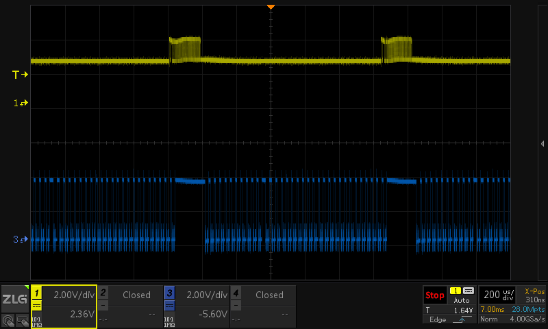 如图1,黄色为canH信号,蓝色为spi ncs信号;