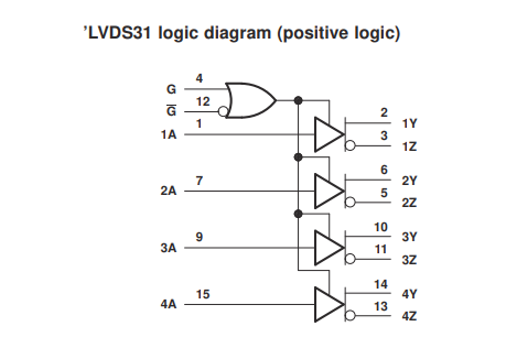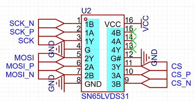 SN65LVDS31驱动器的管脚定义在您的原理图中好像错了,如下截图,2脚和3脚是差分输出,5脚和6脚是差分输出,以及10脚和11脚,13脚和14脚;1、7、9脚是LVTTL输入。我想应该是这个原因造成的。