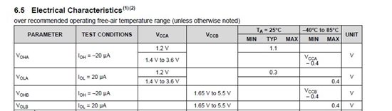 想知道TXB0104 IC 在满足VCCA<VCCB 等所有条件下,各方向的输出电压和电流是什么样的?datasheet 里没有说明