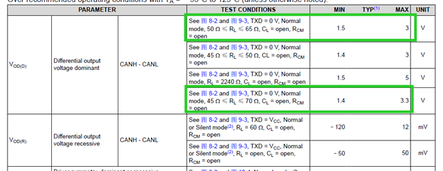 我们使用的TCAN1043DMTRQ1,在总线一致性测试时测出显性电平为3.12V,规格书中关于显性电平的定义如下图