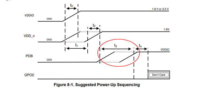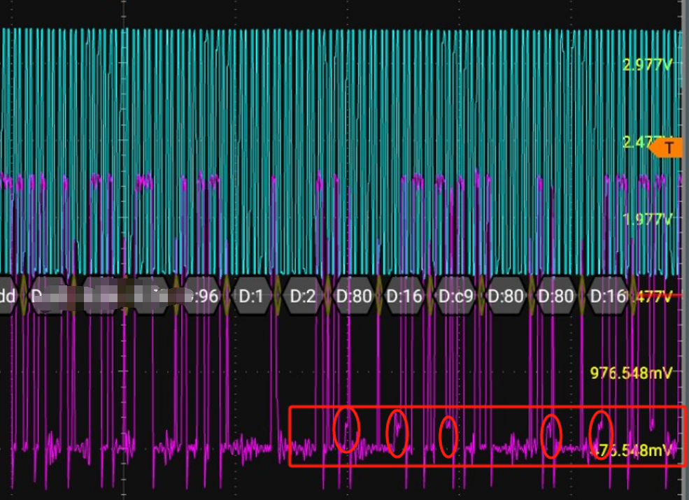 当整个模组上电时,电源建立完成后13ms左右,ISP开始读取EEPROM数据,但是当数据读到96 01 02 a0时(此时时间约为13.9ms左右)a0的bit[5]会被拉低,导致变成96 01 02 80。波形如下图: