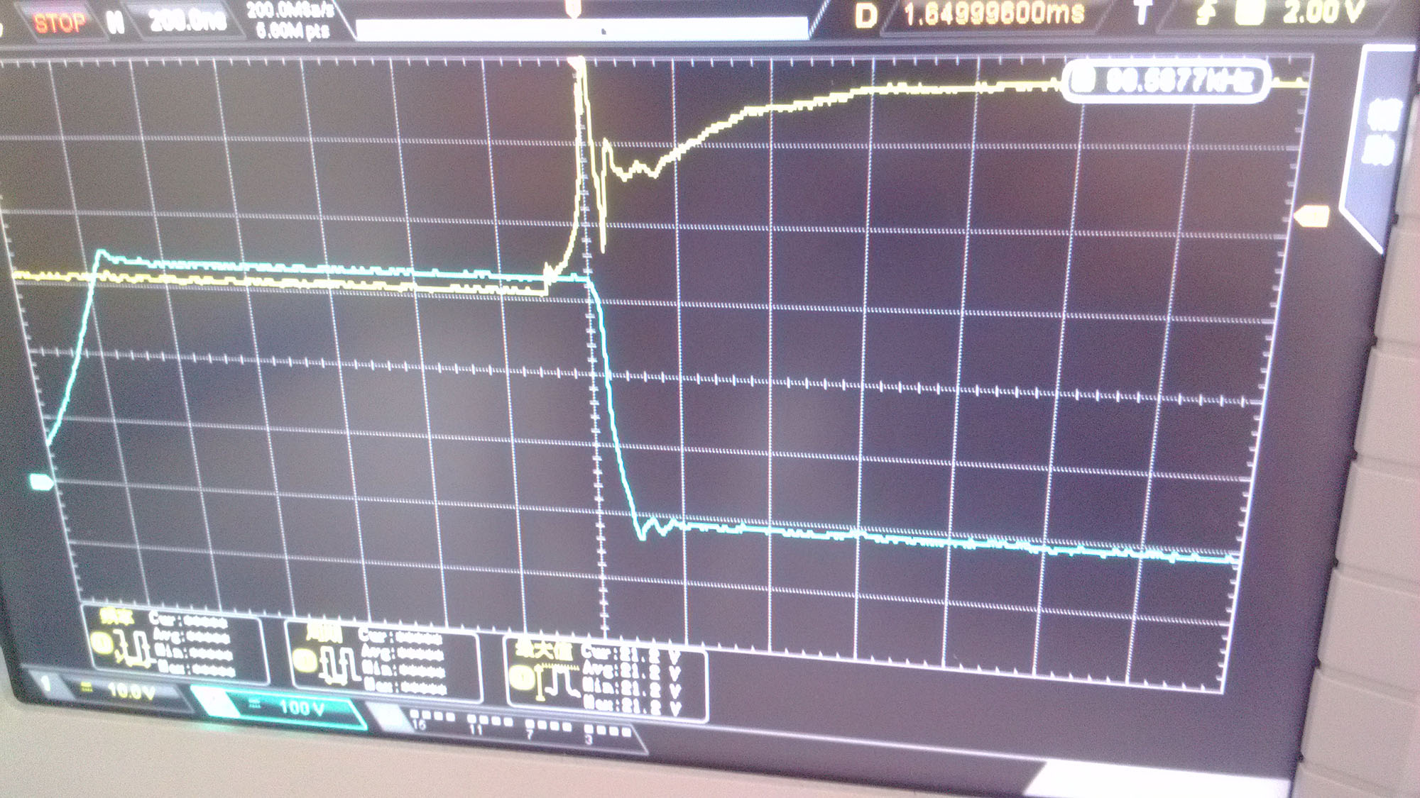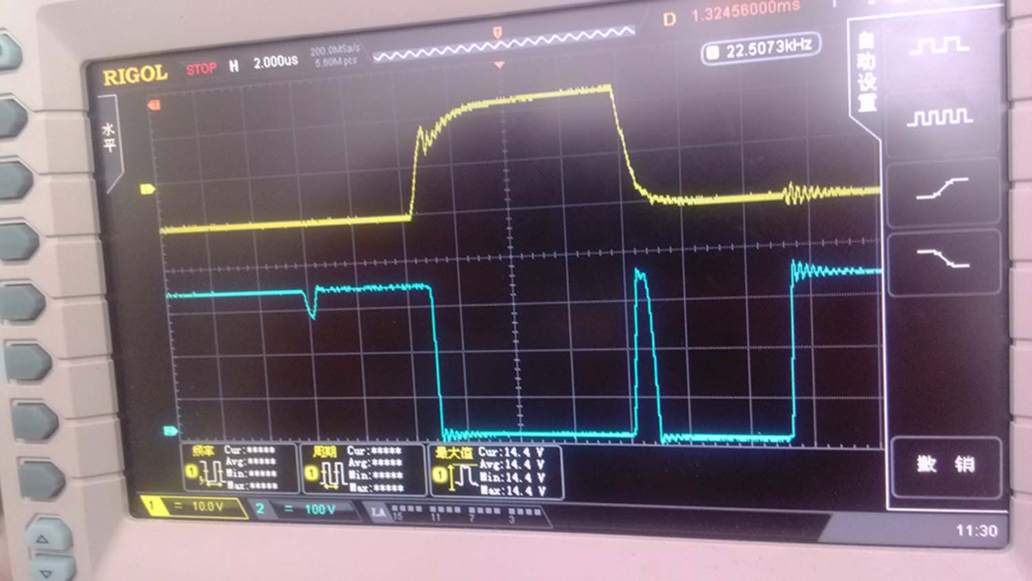 这个图是在IGBT的GS端并了一个0.01uf电容和10电阻,波形好了一点,但是IGBT发热依然严重,达到100度。电流才5A,IGBT的驱动能力为40A。