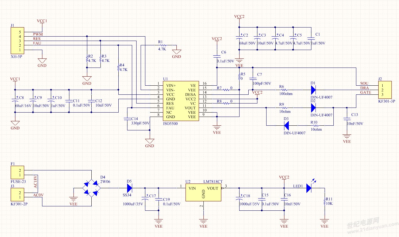 供电电压有变化,将R5换成0.1uf电容,VE-VEE加10V电压,产生负压用,VCC2-VEE加25V电压,这样就会产生-10V至+15v波形。