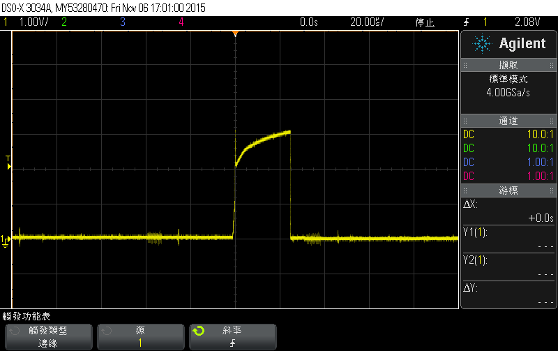 下图是修改信号线路上连接到地的电容,将容值减小,信号在1v拉升后,较之前能稍微快速恢复电平