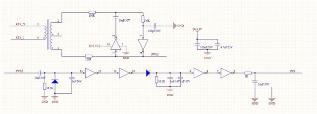 • 有个应用,要求功耗低的隔离DI输入,外部是干接点。如果自身提供隔离电源,用光耦判断的方式,原理可行,问题在于隔离电源模块自身静态功耗太高。如果用隔离变压器做,外部DI没输入时是开路,由变压器的原边充当电感,让皮尔斯振荡电路振荡,外部DI输入短路变压器副边,阻抗折算过来还是0,皮尔斯振荡电路停止工作,根据振荡来判断DI状态。只不过DI输入时,非门工作在非法的的状态,输入输出电压相等。带缓冲的非门外部DI变化后,振荡频率会变高好多倍,非门不会进入跟随状态。