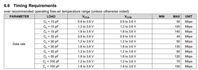 使用TXB0304做USB传输,data rate够吗?USB2.0的data rate也要480Mbps。 下面是不同容性负载下TXB0304支持的data rate。