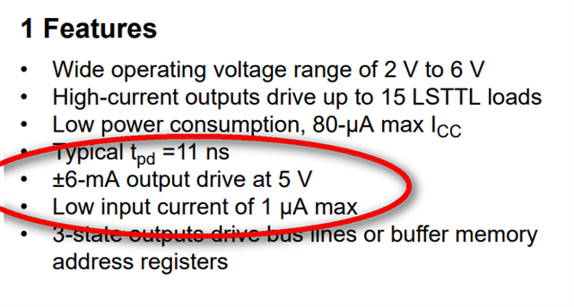 您好,SN74HC241的驱动电流为6mA(5V供电),正负代表电流方向,负值代表source 电流,正值代表sink电流。