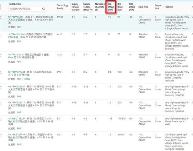 如果需要驱动电流大一些的8路缓冲器,不知您具体需要多大的驱动能力,可以直接在选型链接里进行筛选。其中Io就代表它的输出驱动电流,这个是我筛选出来的8路,电流大于8mA的筛选结果: