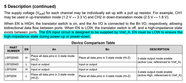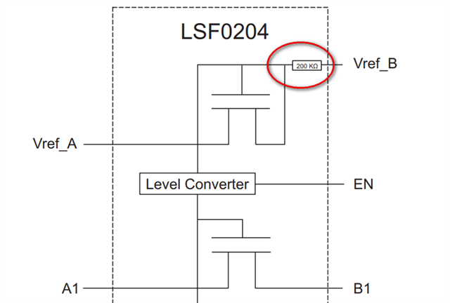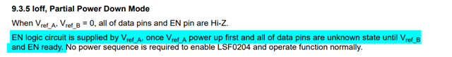 对于LSF02系列的,200KΩ电阻是集成在芯片内部的。悬空EN,相当于EN接高电平,而此时VREF_A没有供电,不建议让电路处于这种状态,在上电和掉电期间,建议EN拉低以保证端口处于高阻抗状态。