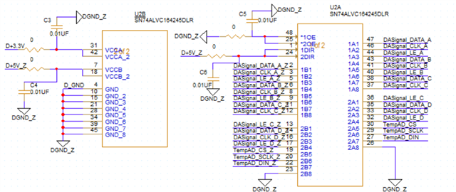 您好,这是我使用SN74ALVC164245的原理图设计。使用这个设计的时候,我遇到了2个问题。