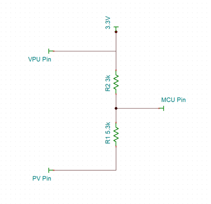 但是、还有另一种选择:由于 PV 引脚使用其自己的电源、因此可以将 VPU 直接连接到3.3V 并使用分压器将输出电压保持在 MCU 的安全范围内、如下所示: