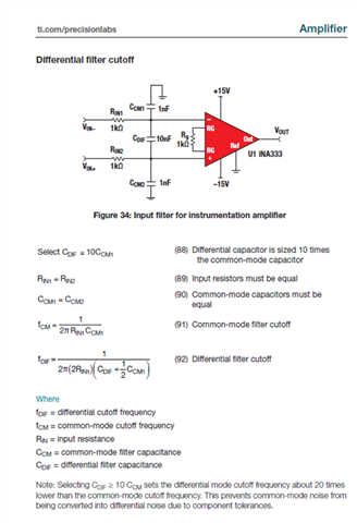以下是您的项目的起点。 输入具有共模及差分滤波器。 您可以根据以下公式调整截止频率(来自《模拟工程师口袋参考书》)。 输出滤波器是用于驱动 ADC 输入的典型滤波器、但您可能需要根据您选择的 ADC 对此进行调优。 ADC 团队可以帮助选择输出滤波器。 对于这种电路、需要记住的一点是、随着分流电流变得很低、电路的输出也将很低。 opa387的 输出摆幅限制为10 k 负载时为10毫伏、重负载时为100毫伏、请参阅图15)。 关键是对于低电流电平、输出将为低电平、运算放大器将超出输出摆幅、从而导致非线性输出。 如果您使用负电源(例如-300mV)、则可以消除此问题。 尽管如此、大多数应用都使用单电源配置(V-= GND)。 只需记住、如果您使用单电源配置、在低电流下便会有有限的精度。