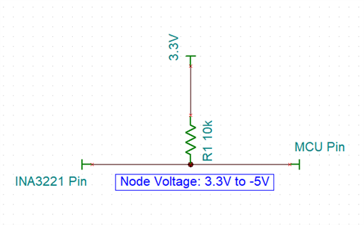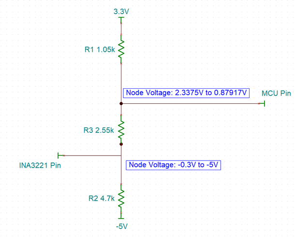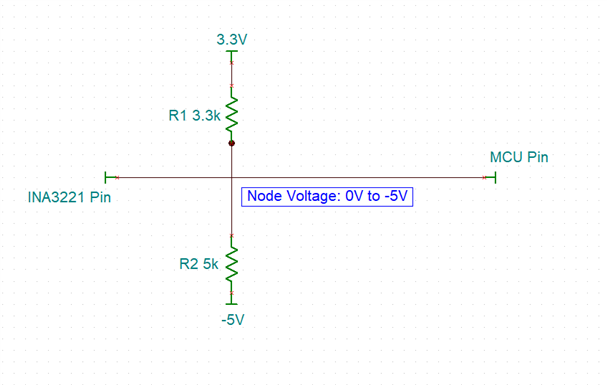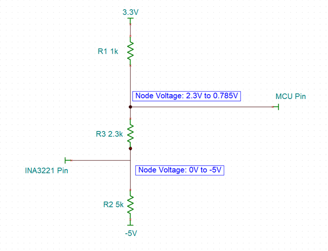 我曾想过这个问题、我想我能为您找到解决方案、但它每个信号需要3个电阻器。 问题在于、在负电压和电流监控的情况下、两个器件(INA3221和微控制器)的逻辑电平不匹配或不处于安全工作条件下: