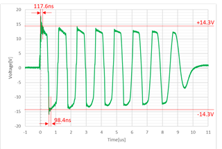 雷击浪涌测试中的 OUT 引脚电压 如图所示。