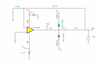 我们可以看到二极管 P 和二极管 N 有助于保护放大器的输出、从而防止在运算放大器的输出端出现任何过压。