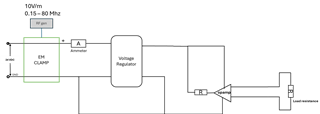 是的、它是符合 EN/IEC 61000-4-6标准的传导易感性测试。 随附了以下方框图以供参考及其设置概述。 电流表中的电流读数用于随施加的噪声而变化、即使负载检测电阻电流没有变化也是如此。