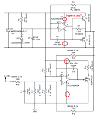 我没有看到电源轨中需要的旁路电容器。 如果这是单电源轨、那么每个运算放大器需要一个最小值为0.1uF 的旁路电容。 如果运算放大器配置采用双电源、则每个电源轨上需要两个0.1uF 的最小值。