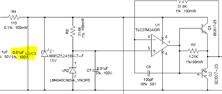 齐纳二极管具有寄生电容。 在高频下、寄生电容占主导地位、Vref 无法正确钳制电压。 I 会将 C7和 C3增加至低 ESR 1uF (可能为2.2uF)、以对高频进行去耦。 如果 U1处没有稳定的 Vref、V-I 电流转换将无法正常工作。