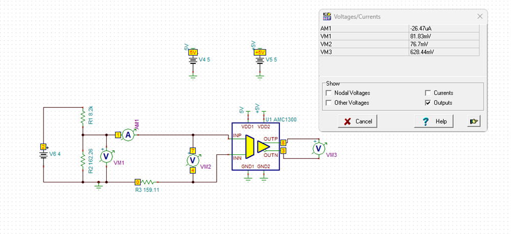 在温度测量模拟通道中、我遇到了与 AMC1300相关的问题。 在我们的设计中、PT100传感器用作模拟前端中的可变电阻器(R2) 正如预期的那样、PT100的电阻会随温度而变化。
