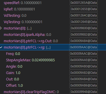 由于我只是检查 PWM 生成、我正在使用构建级别 FC_LEVEL1、并且我尚未将 INV 与 LaunchPad 连接、因此我看到我的 EPwm6Regs.TBCTR 正在计数、但我无法在为其配置的同一个 GPIO10 引脚上看到 PWM 生成。 我没有得到的绘图,这是预期根据用户指南的“dlogch",“,它是恒定的零,因为这个独立的电机驱动器,所以它将工作与一个电机,你可以参考我的观察变量在上面的帖子清晰的图片只是忽略图形,和我得到的另一个问题是它不进入实时,值只是在我暂停调试或继续时才会发生变化。