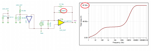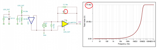 总噪声中有一半来自 LMP7721的输入电压噪声集成在其带宽范围内-参见下文。
