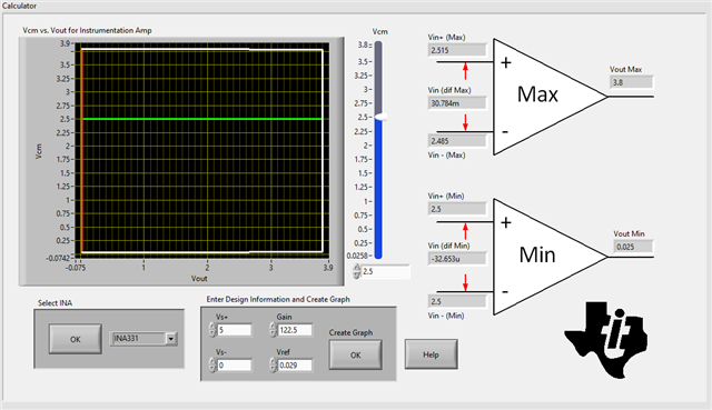 我们有一个称为模拟工程师计算器的计算器。 此计算器内有另一个名为INA VCM v VOUT的计算器。 在此工具中,您可以选择INA331,输入您的设计规格,如电源,增益,参考电压和VCM,该工具将输出线性设计的线性范围