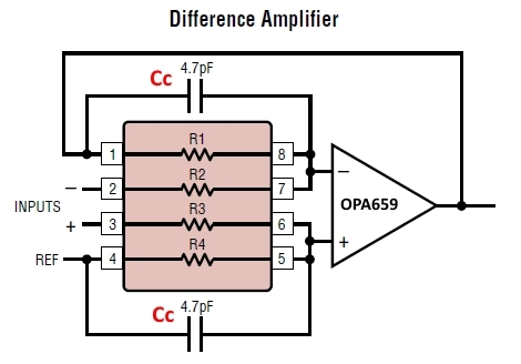 输出电压=[(RF||1/SCC)/(rg||1/SCG)]x (Vin+- Vin-)。