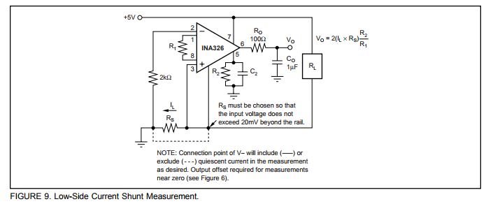我想测试直流电流,范围是20uA - 50mA, uA的预期精度是5 % ,1 % - 2 % 是mA;我想选择低侧电流并联测量的INA326,我的应用中INA326的Vs是3.3V。 电阻器Rs应小于1欧姆,因为Rs之间的电压降应小于50mV (对于我的应用),理想的Rs应小于0.5欧姆,我有一些关于INA326的问题: